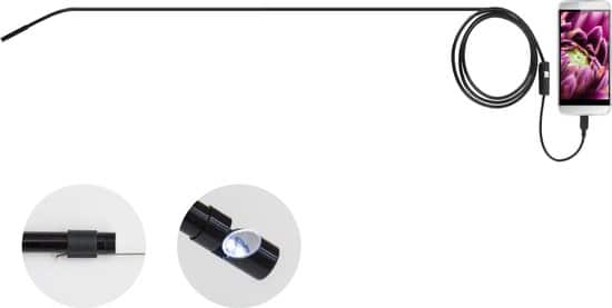 De endoscoop heeft een kabel van maar liefst 2 meter lang, zodat je op de meest moeilijk bereikbare plekken kunt komen. Via de speciale app die je op je smartphone, tablet of laptop installeert, kun je video’s en geluidsopnamen opslaan. De endoscoop heeft een Micro USB-poort en wordt standaard geleverd met een Micro USB naar USB-kabel. Hierdoor is het eenvoudig om opnamen rechtstreeks op je device te bewaren. De LED-verlichting aan het uiteinde van de camera is in 6 helderheden verstelbaar, eveneens via de app. Wil je iets opvissen wat je hebt laten vallen, bijvoorbeeld in een putje? Dan zijn de meegeleverde mini-haakjes handig! Je bevestigt een haakje aan het uiteinde van de camera en kunt zo proberen een voorwerp (je trouwring in de gootsteen bijvoorbeeld) te pakken te krijgen.