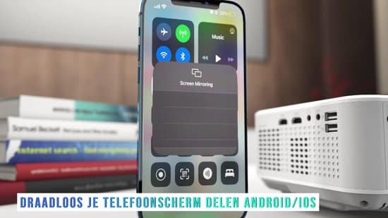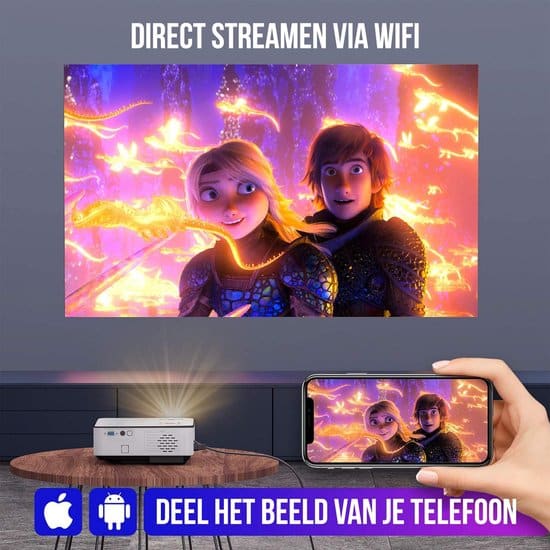 Via screen mirroring deel je gemakkelijk het scherm van je telefoon met de beamer. Dit gaat via WiFi en werkt met Android en iOS. Ideaal om films direct te streamen naar de beamer of om oude foto’s terug te kijken zonder het gedoe van extra kabels.