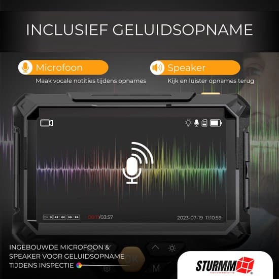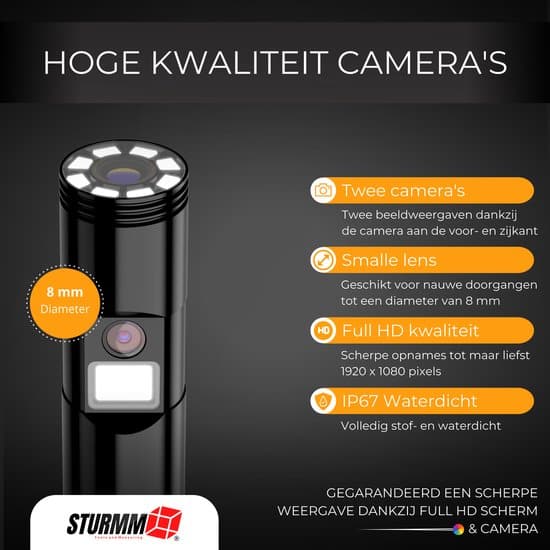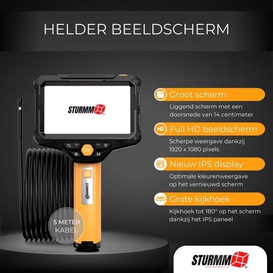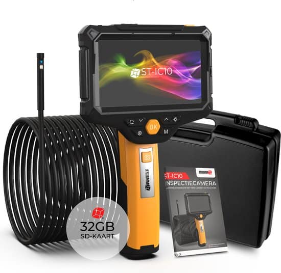 Ontdek het endoscoop assortiment van STURMM® en inspecteer moeilijk bereikbare gebieden met één van onze hoog beoordeelde inspectiecamera’s. Model ST-IC10 wordt geleverd met een afkoppelbare videokabel van 5 meter, twee HD camera’s, geluidsopname systeem, vernieuwd IPS kleurendisplay en ingebouwde zaklamp aan de achterzijde van het apparaat. De endoscoop wordt als complete set geleverd met een opbergkoffer én 32GB micro SD kaart.
