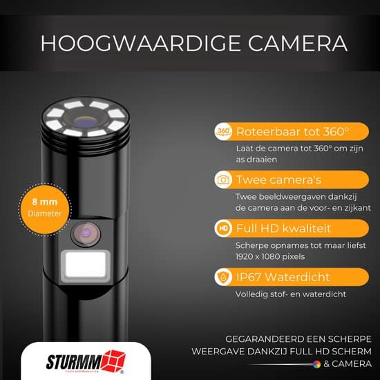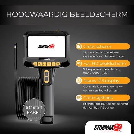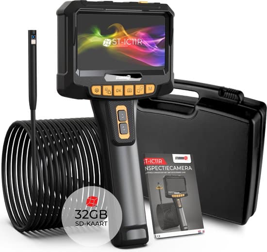 Ontdek het endoscoop assortiment van STURMM® en inspecteer moeilijk bereikbare gebieden met één van onze hoog beoordeelde inspectiecamera’s. Model ST-IC11R wordt geleverd met een afkoppelbare videokabel van 5 meter, twee HD camera’s, bestuurbare cameralens tot 360° en een vernieuwd IPS kleurendisplay. De endoscoop wordt als complete set geleverd met een opbergkoffer én 32GB micro SD kaart.