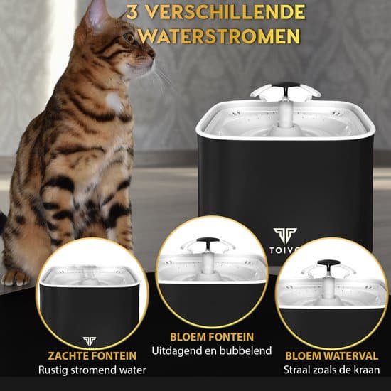 Bloemen waterval: Geeft een stroom zoals een bidet dat doet en is ideaal voor katten doordat deze “stromend” water insinctief verkiezen boven “stiltaand” water.