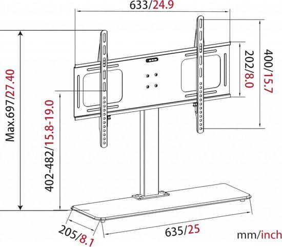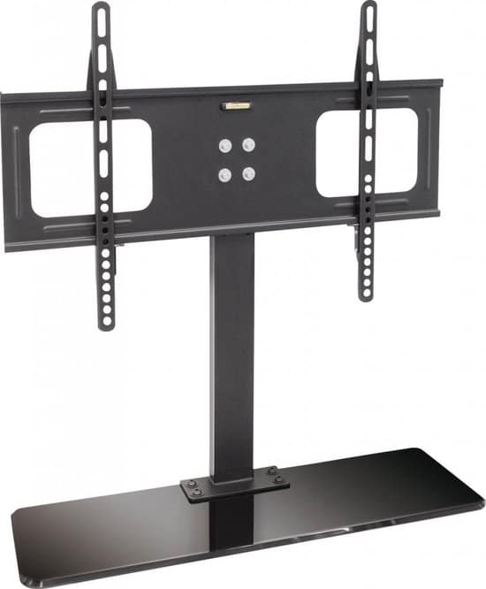 Universele tafel-/bureaustandaard voor flatscreen TV’s en monitoren. De tafelstandaard is in hoogte verstelbaar en geschikt voor schermen van 32 t/m 65 inch met een maximaal gewicht van 50 kg. Het VESA gatenpatroon is minimaal 75 x 75 mm tot maximaal 600 x 400mm. De maximale hoogte is 697mm (incl. armen) en de afmeting van de glazen voet is 650 x 205mm. De plaat is gemaakt van 8mm dik veiligheidsglas.
