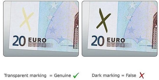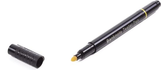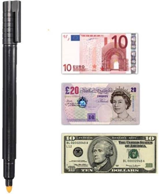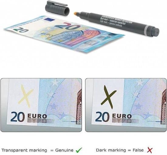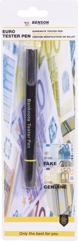 Euro Quick-Tester, Geldcontrole Pennen Euro Quick-Tester – controlestift – Maak een markering op lichte deel van het biljet. Zodra dit donker gaat kleuren is het bankbiljet vals. Zo eenvoudig (en goedkoop) kan het gebruik zijn. De pen heeft een goede score als het gaat om de valse biljetten te ontdekken, maar werkt beperkt om veiligheid tegen valsemunters te bieden. Omdat een gedeelte van Euro-falsificaten het papier chemisch behandelt wordt, wordt hiermee de werking van de valsgeld stift omzeild. Kenmerken: