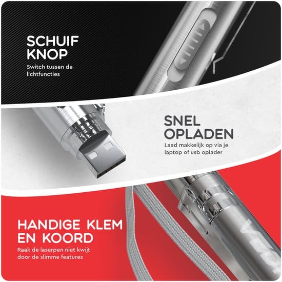 De VEDIC laserpen is sterk en gaat lang mee. Het is gemaakt van stevig RVS en kan tegen een stootje. Opladen is makkelijk en snel, in slechts 1,5 uur is de laserpen weer klaar voor gebruik. Zo hoef je niet steeds nieuwe batterijen te kopen en dat is beter voor het milieu.