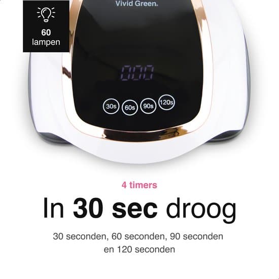 Onze Vivid Green Nageldroger zorgt ervoor dat je nagels binnen no-time droog zijn en je weer stralend de deur uit kan! De gellak lamp bevat vier timers, een low heat functie en intelligente handherkenning om je nagels optimaal te drogen en harden. De nagellamp is voorzien van 42 krachtige UV-ledlampen van 168W die de droogtijd verlagen!