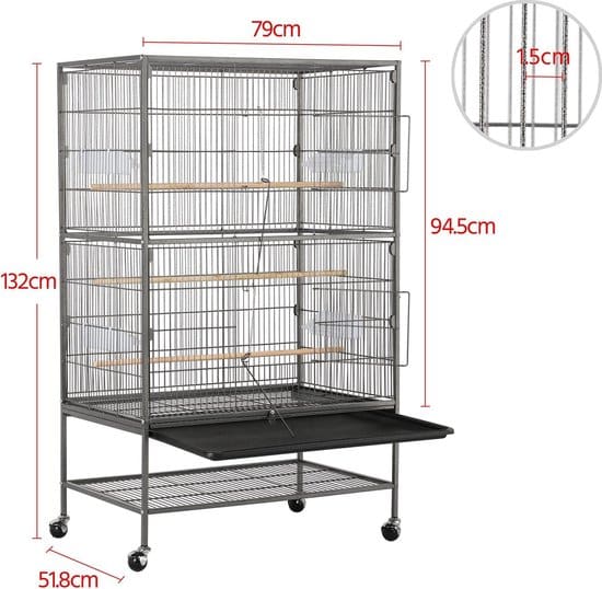 - Robuust en duurzaam: het robuuste stalen draadframe is voorzien van een poedercoating en daardoor roest- en verouderingsbestendig. Het oppervlak is natuurlijk veilig voor de dieren. Deze vogelkooi meet 79 x 52 x 132 cm (l x b x h).