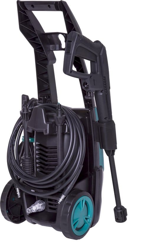 - De hogedrukreiniger is voorzien van wielen en een handel waardoor deze eenvoudig te verplaatsen is.