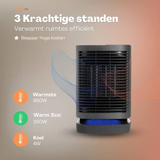 Je kunt met een druk op de knop de stand van de kachel veranderen. Kies zelf welke stand je graag wilt hebben. De kachel beschikt over 3 verschillende standen. Extreme warmte (950W), minder extreme warmte (550W) of normale wind (4W). De ‘natuurlijke wind’ stand maakt gebruik van de omgevingstemperatuur en verwarmt de ruimte verder niet.