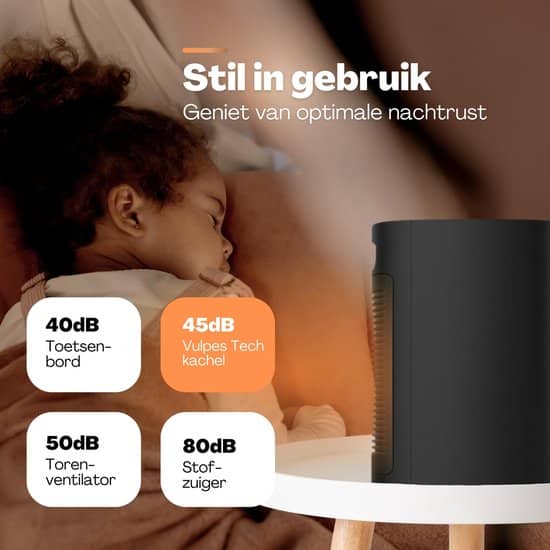 Met een geluidsniveau van minder dan 45dB is de kachel van Vulpes Tech® nagenoeg volledig stil. Je zult dus geen last hebben van storende geluiden die uit de kachel komen en dus kan je met een gerust hart studeren of werken.