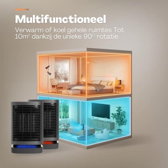 De ventilatorkachel draait 45° naar links én 45° naar rechts. Zo heb je dus een totale draaihoek van wel 90°. Zo vul je eenvoudig de hele ruimte met een aangename warme bries. De kachel draait rustig en ritmisch op en neer. Dankzij de draaihoek verwarm je de gehele ruimte snel en effectief en heb je geen andere hulpmiddelen nodig om de ruimte snel warm te krijgen.