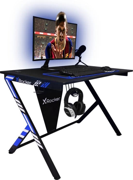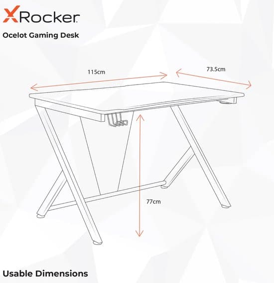 Creëer het ultieme podium voor je gamespullen met de gloednieuwe X Rocker Ocelot Gaming Desk, met een opvallend kruisvoetontwerp met optionele gekleurde stickers in blauw of rood. Met een stalen metalen basis, MDF houten tafelblad en gladde koolstofvezel effect coating, de Ocelot biedt een stevige en duurzame platform voor uw spelcomputers of PC. Voor werken of spelen met meerdere schermen is dit grote computerbureau voorzien van 2 kabelopbergers, een headset-haak en bekerhouder om uw werkruimte georganiseerd te houden en vrij van draden en rommel. Muismat niet inbegrepen.